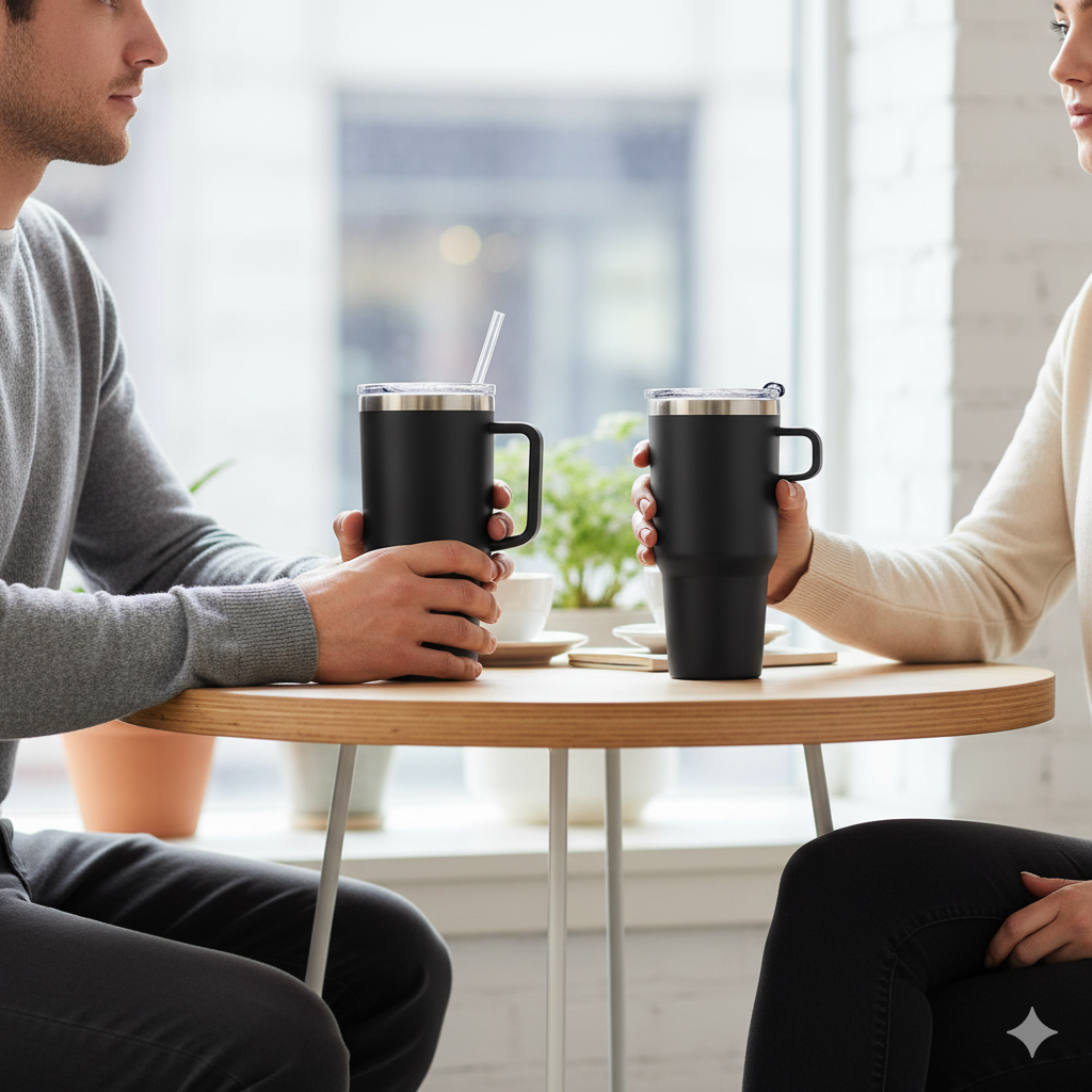 Our 40oz Black Tumbler is designed for all-day use, keeping drinks cold for up to 24 hours or hot for 12. Crafted from premium 18/8 stainless steel with copper insulation, its sleek matte finish and sweat-free grip make it perfect for work, travel, or outdoor adventures.